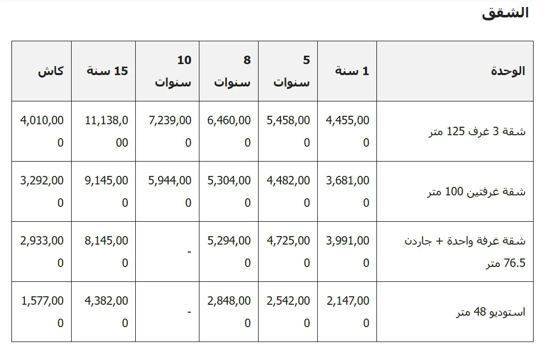 حيث تبداء من 4 مليون علي 15 سنة وتختلف حسب مده تقسيط حيث يصل خصم الكاش الي 64%