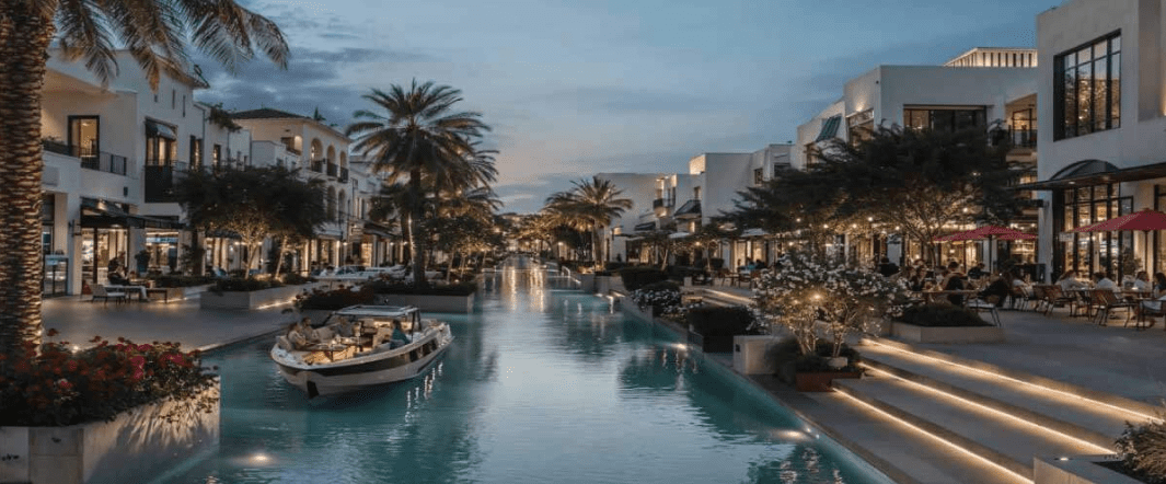 تتركز حولها المطاعم الفاخرة، المقاهي، والمتاجر العالمية، ما يوفر تجربة تسوق وتناول طعام فريدة ومباشرة للسكان.