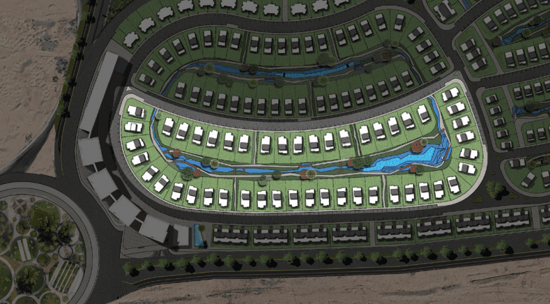 كمبوند فيه مسارات للمشي والجري وركوب الدراجات ضمن المساحات الخضراء. -