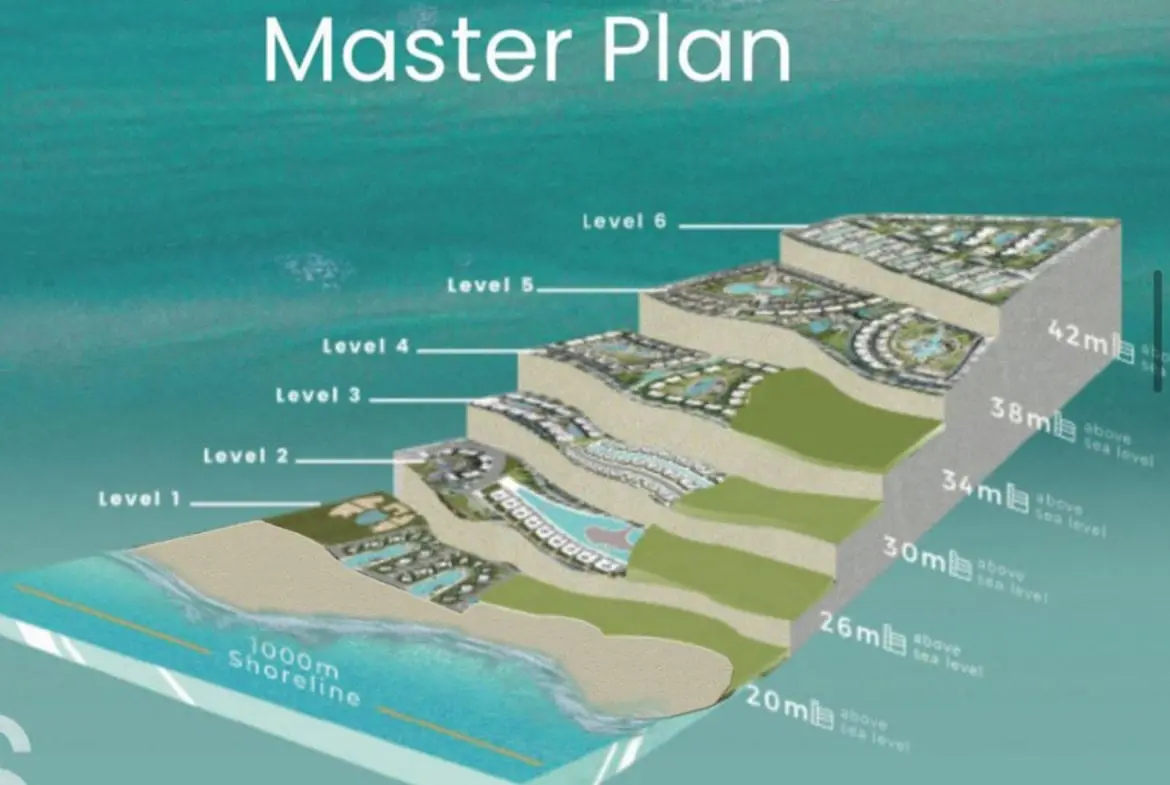 المشروع يمتد على مساحة ضخمة تم تصميمها بعناية لتوفير أقصى درجات الخصوصية والراحة. يتميز التصميم بتقسيمات ذكية للمساحات والمسارات، مع مراعاة النسب بين المساحات الخضراء والمباني، بالإضافة إلى المسطحات المائية واللاگونز.