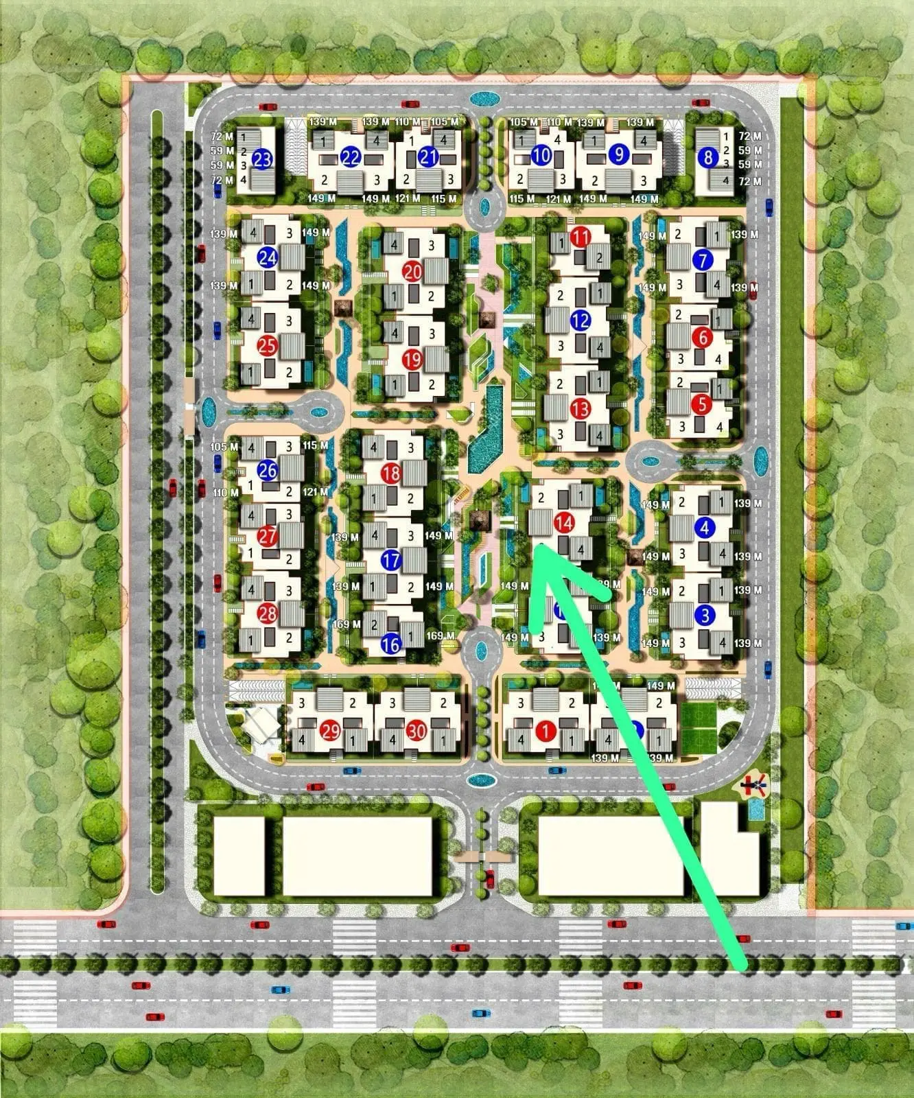 - مساحات خضراء واسعة تغطي 80% من إجمالي المشروع
