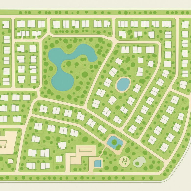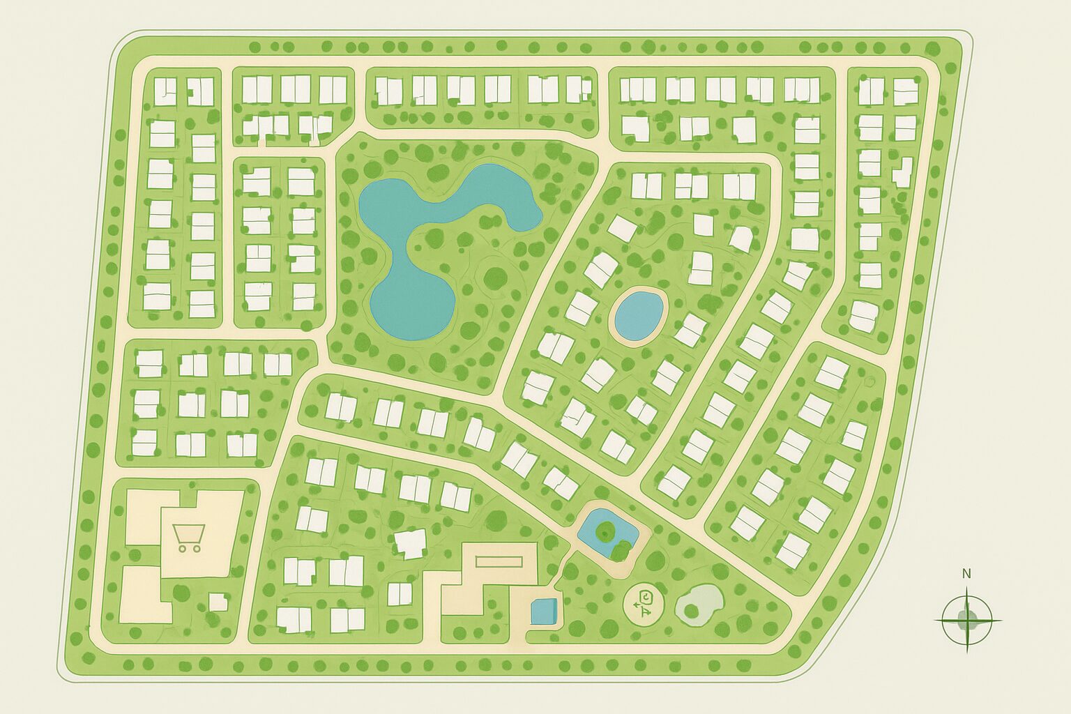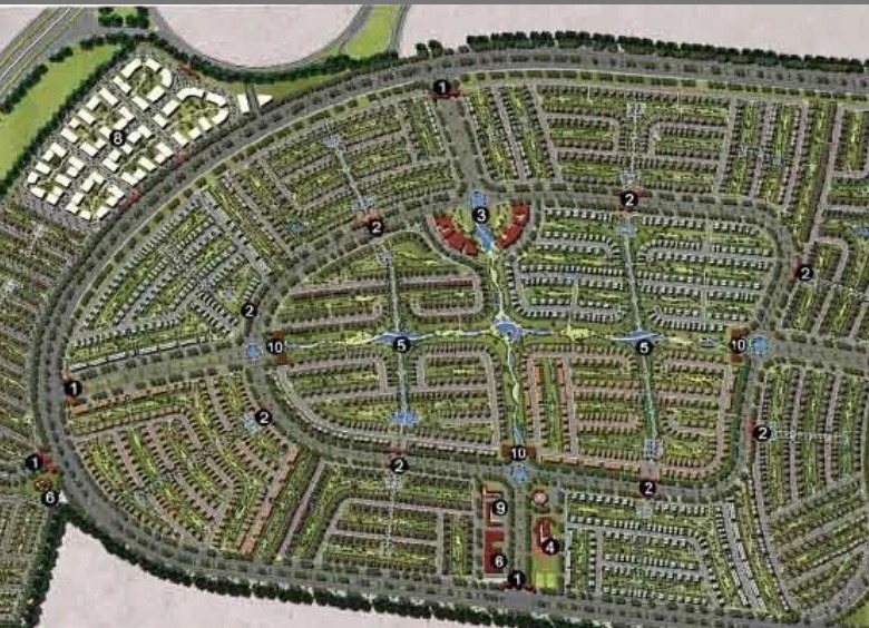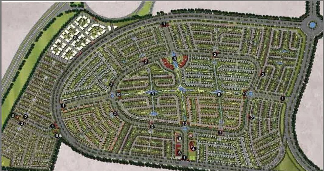 مع محور مركزي أخضر وحدائق وبحيرات صناعية ومسارات مشي ودراجات. نسبة البناء لا تتجاوز تقريبًا 15%