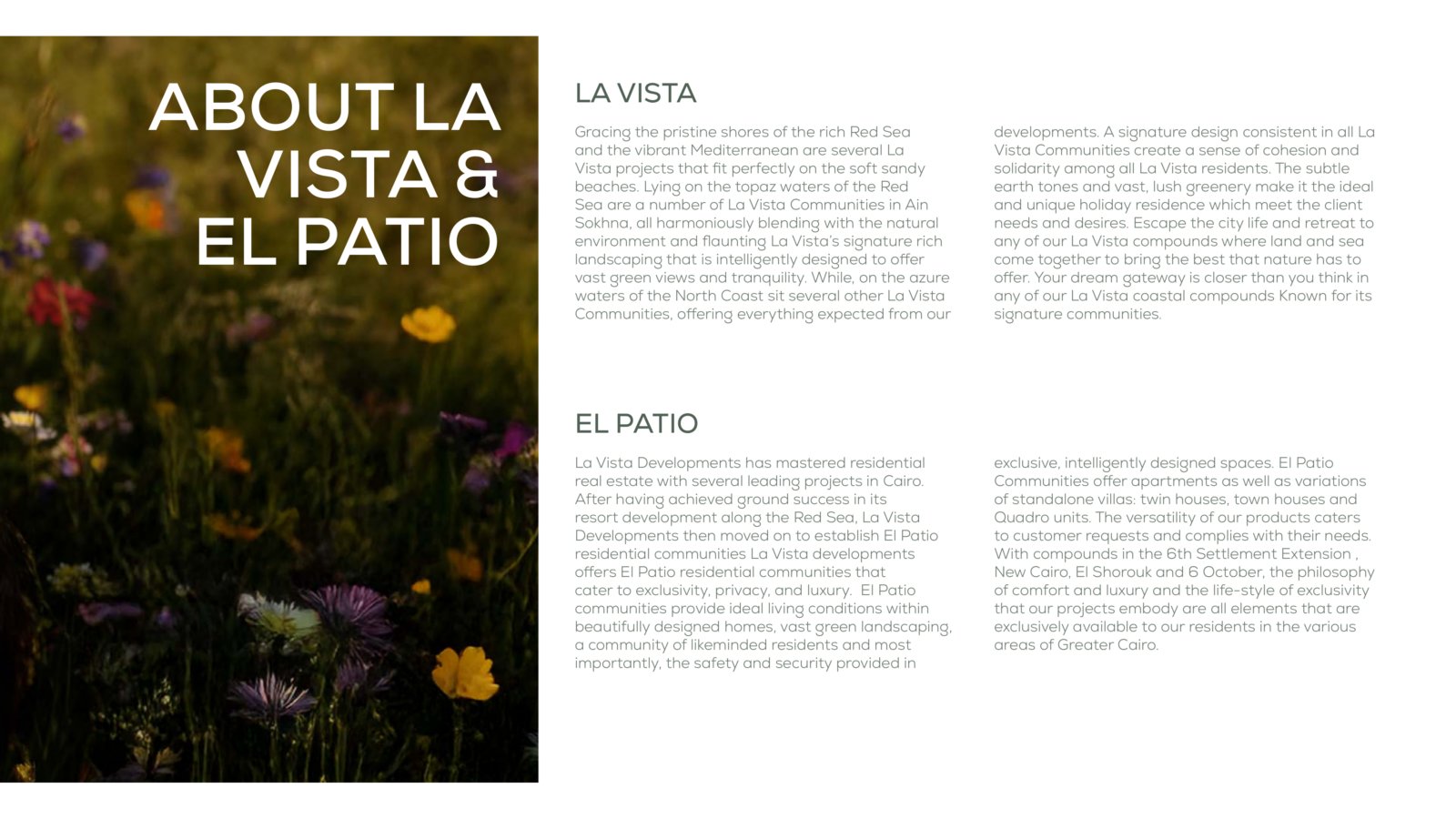 مشروع لافيستا الجديد – El Patio Jade: توازن الحياة والفخامةمشروع لافيستا الجديد El Patio Jade يقدم تجربة سكنية فاخرة في القاهرة الجديدة على مساحة 100 فدان مع مساحات خضراء وبحيرات، يضم فيلات وتوين هاوس وتاون هاوس مختلفة المساحات، ويتميز بنظام دفع مرن حتى 10 سنوات.